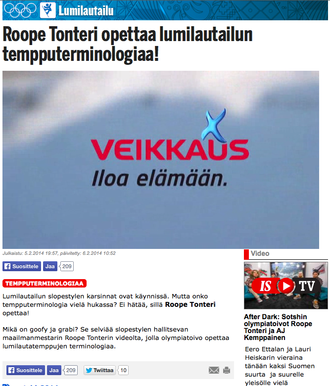 Yhdessä Roope Tonterin kanssa tehtiin video, jossa avattiin hyvin yksinkertaisesti lumilautailun perustemppuja ja terminologiaa. Tavoitteena oli saada ihmiset kiinnostumaan lajista ja oppia seuraamaan sitä. Video julkaistiin juuri Sotshin olympialaisten alla. Se herätti paljon kiinnostusta, ja jopa iltapäivälehdet jakoivat sen sivuillaan.